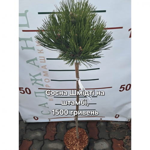 Сосна білокора «Шмідті» на штамбі (Pinus leucodermis / heldreichii 'Schmidtii') — це мініатюрне вічнозелене дерево з щільною кулястою кроною, що прищеплене на стовбур (штамб). Вона цінується за надзвичайно повільний ріст та витривалість, що робить її ідеальною для альпінаріїв, контейнерів та невеликих садів.