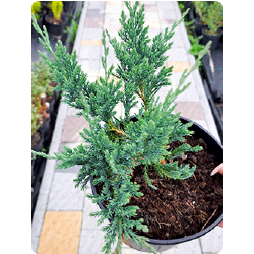 Вічно зелений, компактний, щільний, декоративний чагарник, який має стелючу форму крони висотою 30см і діаметром 2 м з яскраво синьою хвоєю, яка до зими змінює свій колір на фіолетово-пурпурний. Перевагою цієї рослини є його компактність, невибагливість і морозостійкість.