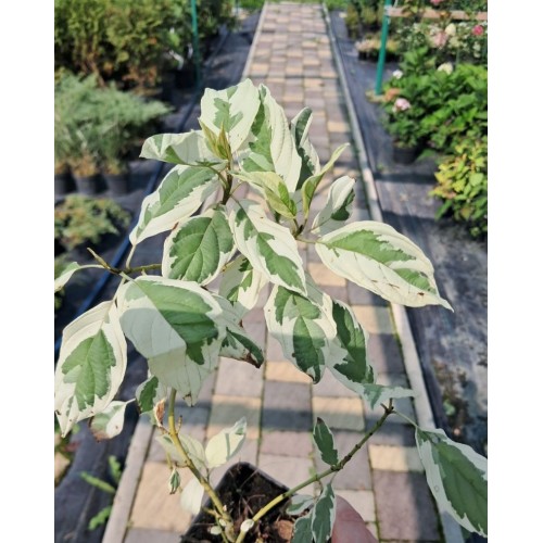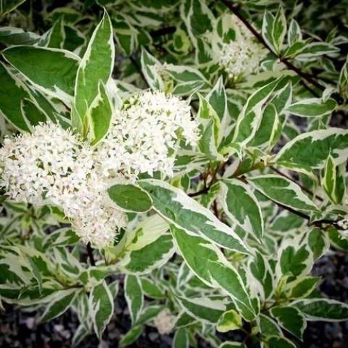 Дерен Елегантіссіма (Cornus alba 'Elegantissima') - це декоративний листопадний кущ, відомий своїми строкатим листям та яскраво-червоними пагонами взимку. Він має яйцеподібні сіро-зелені листки з білими краями, а його молоді пагони восени та взимку стають червоними, що створює ефектний контраст на тлі снігу.