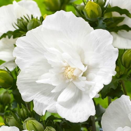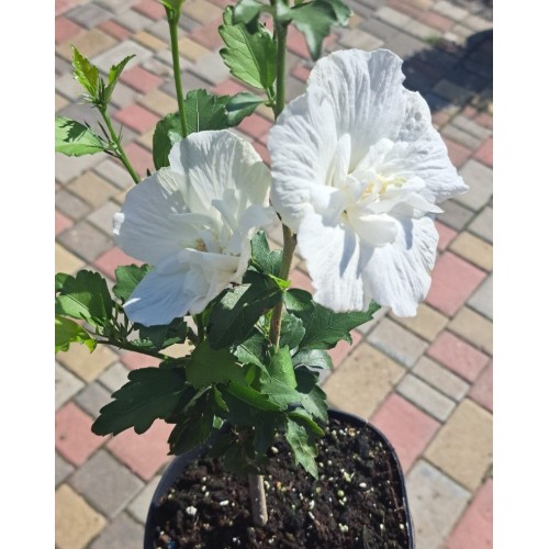 Гібіскус сирійський "Вайт Шифон" (Hibiscus syriacus 'White Chiffon') - це декоративний листопадний кущ з великими, махровими, білосніжними квітами. Квітки можуть сягати 9-12 см в діаметрі. Цвітіння триває з липня по жовтень. Кущі можуть виростати до 2-3 метрів у висоту, з округлою кроною. Гібіскус 'Вайт Шифон' невибагливий у догляді, але краще росте на сонячних ділянках з добре дренованим ґрунтом